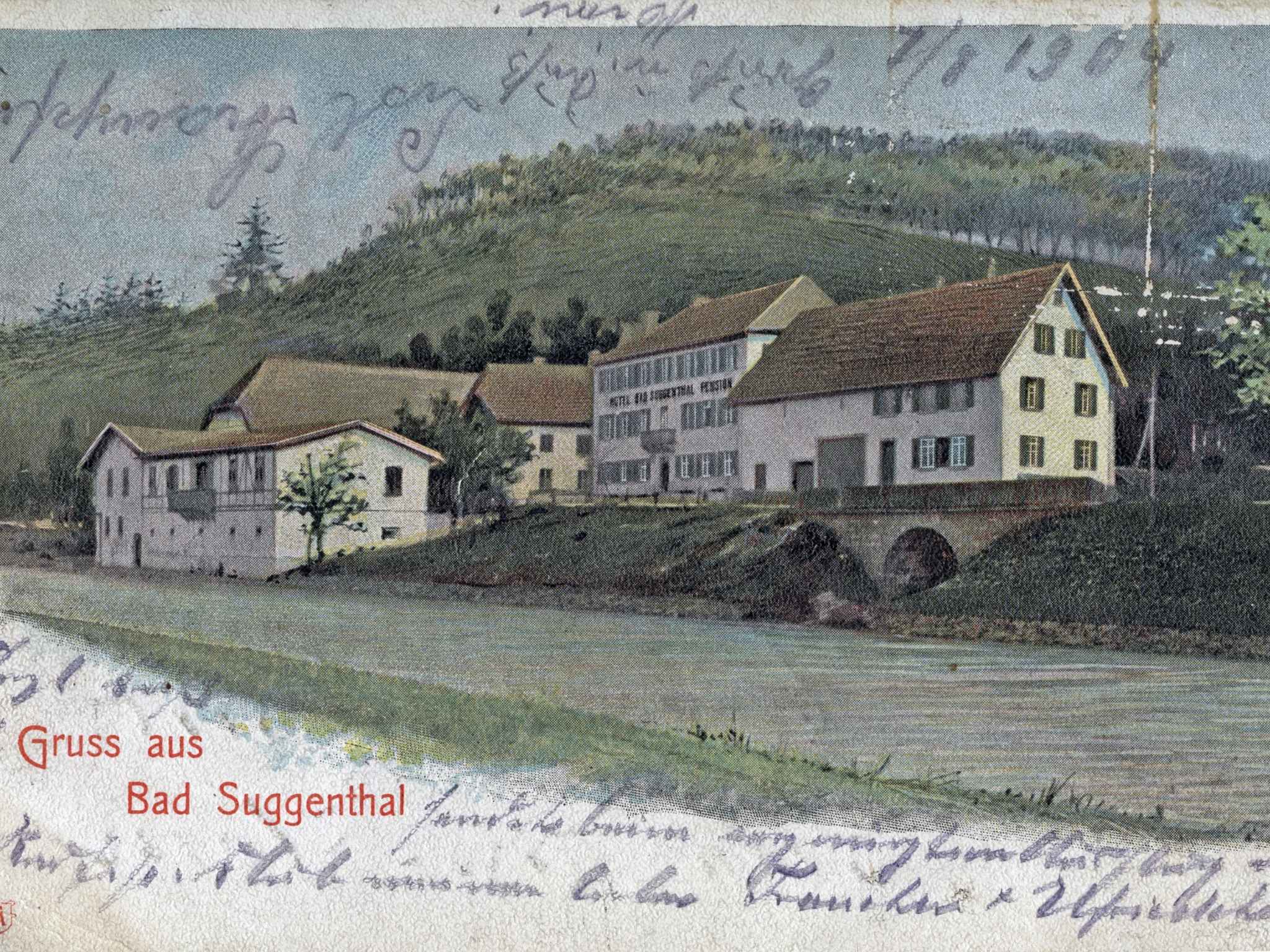 Postkarten gehören seit mehr als 150 Jahren zu den beliebtesten Urlaubsgrüßen. Auch vor mehr als einem Jahrhundert griff man gerne zu diesem Medium – so wie eine unbekannte Person, die im August 1904 eine Ansichtskarte aus Suggental verschickte. Die Karte zeigte das heutige Hotel Suggenbad mit den damaligen Anbauten des Schwefelbads, die heute nicht mehr erhalten sind. Die Postkarte hält einen wichtigen Teil der Ortsgeschichte fest – und zeigt ein Suggental, das es so heute nicht mehr zu sehen gibt.